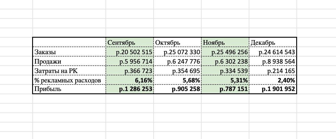 Решили опубликовать краткий отчет для вас, ведь вы же любите сухие цифры и факты! Сравнили два сезона: осень и зиму. И вот, что у нас получилось: смотрите скрин. Месяца с сентябрь по декабрь. Когда посмотрели эти цифры в сравнении от месяца к месяцу, на душе стало очень тепло. Для нас эти цифры показали, что мы смогли разобраться и «оседлать» обновленную систему маркетинга ВБ и зашли даже чуть глубже за нее. А именно поняли на кончиках пальцев, как влиять на каждую конверсию в воронке и успешно обучили этому команду. И смысл кроется не только в самой настройке рекламы, контенте, цене, отзывах. Основной результат - дает правильно выбранный товар в нужной категории и в верном ценовом сегменте. Именно это позволило нам быть такими прибыльными, даже не смотря на откат после 11.11, как было у многих. И в итоге, получилось, что средняя наша выручка за весь 2023г получилась 4 миллиона рублей в месяц. А % рекламных расходов от выручки мы смогли уменьшить в 2.5 раза🔥