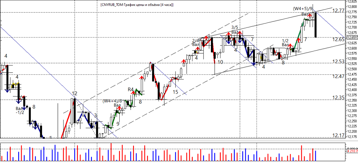 Всем привет! Вчера я делал обзор по основным рублевым парам по теханализу, сегодня я рассмотрю 4-х часовой таймфрейм пары cny/rub с точки зрения альтернативного волнового анализа (AWA), так как я торгую именно по этой системе. Итак, на текущий момент система регистрирует наличие на ценовом графике волнового препятствия в виде вала (W4+5)/9. Это комбинированный цикл, который состоит из 9 волновых пакетов, поскольку в его основе лежит полуцикл W4.