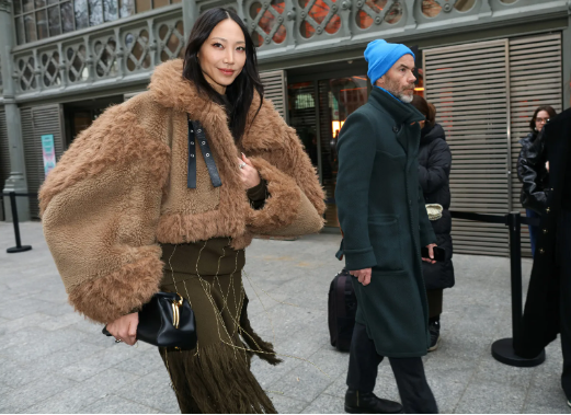 Это пальто на женщине в центре напомнило мне жакет из статьи, которая недавно вышла на тему кастомизации. Нитки и пальтовая ткань.
