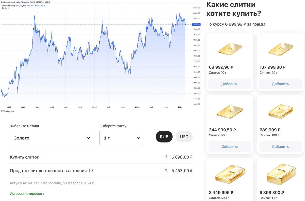 На прошлой неделе я записал большое видео с разбором трех инструментов: вклады в банках, облигации и золотые слитки. По последним я хотел бы еще раз пробежаться, но уже в тексте. Напомню, что Президент РФ отменил НДС в размере 20% на покупку золотых слитков физлицами, что должно по идее повысить интерес к физическому золоту. Тема будет интересна в свете запуска Тинькофф Банком сервиса по покупке золотых слитков с доставкой на дом. Их вы можете заказать прямо в «желтом» приложении банка, выбрав необходимый вес. Благо он начинается с 10 грамм и вплоть до 1 кг. После оплаты, инкассаторы приедут в удобное вам место и вы станете счастливым обладателем золотого слитка. ❗️И все бы хорошо, но есть парочка существенных недостатков у этого инструмента. Более того, когда вы покупаете слиток, то переплачиваете за него еще порядка 15-17%. Цена золота находится вблизи отметки $ 1995 за тройскую унцию на ту же дату. В одной такой унции 31,1 грамм, что ориентирует нас по курсу в 91,3 рублей за доллар