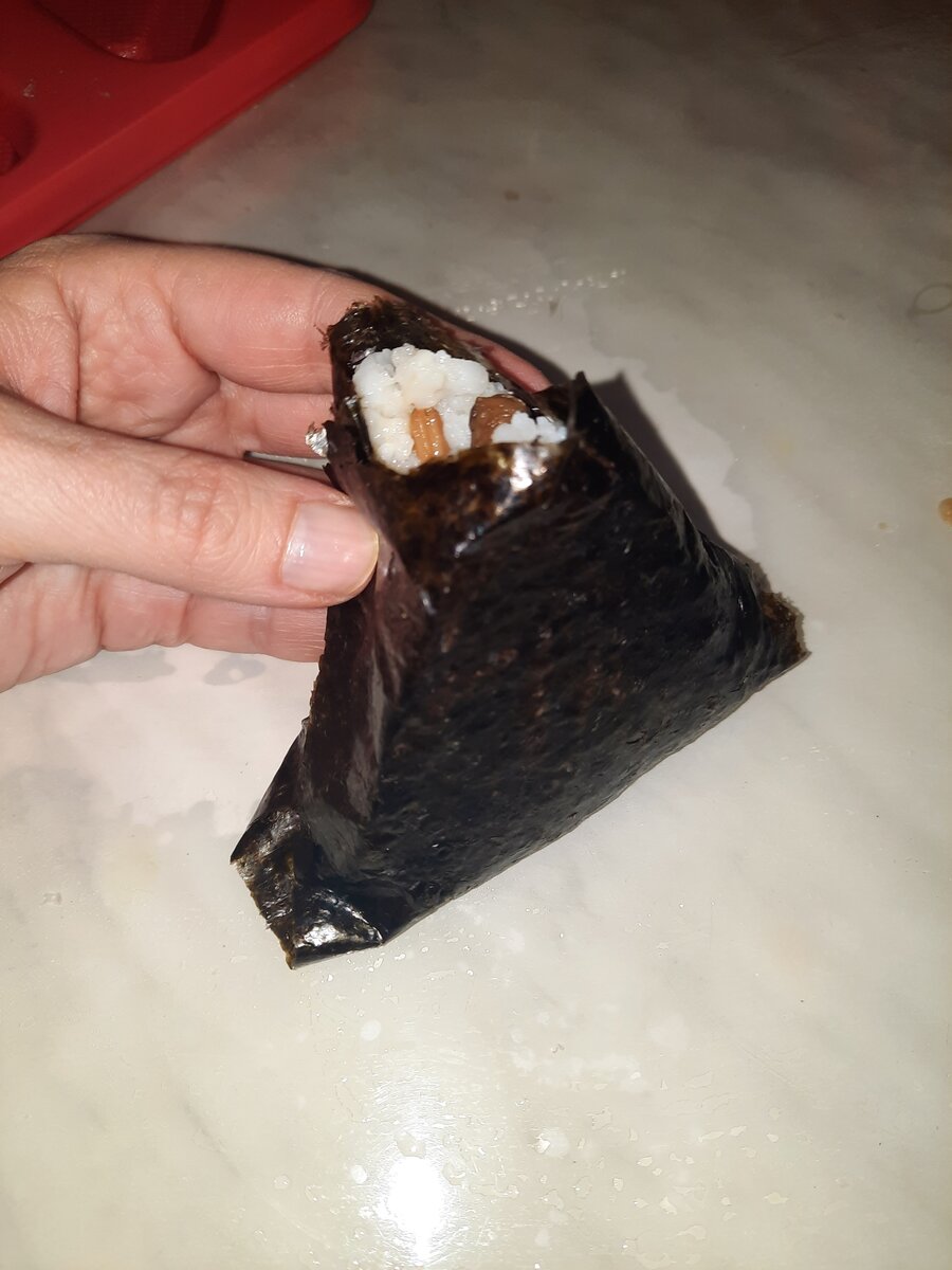 Получилось 3 порции онигири с рыбной начинкой. Риса осталось еще немного и поэтому в него положила другую начинку. Была готовая подлива из тушеных вешенок с овощами.