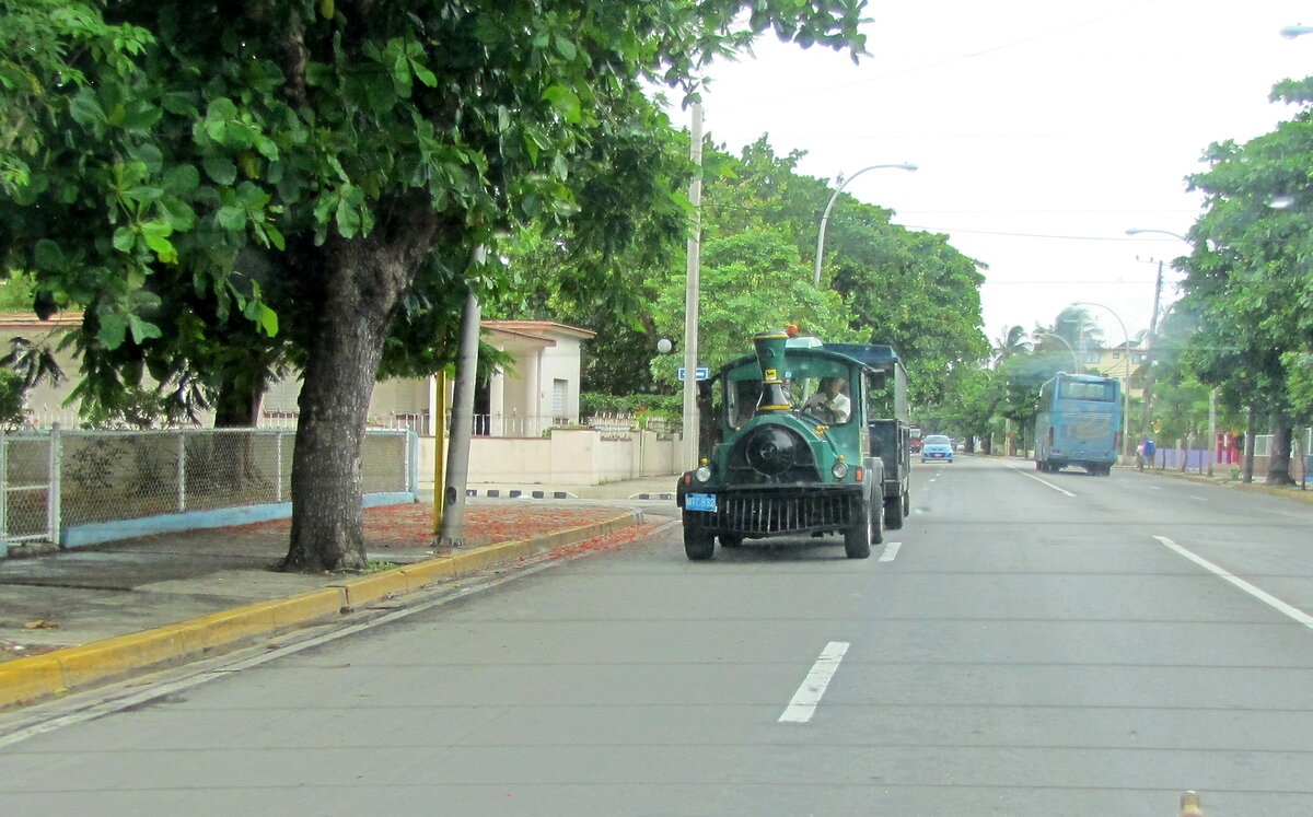Например, вот такой автопоезд, курсирующий по Варадеро. Снять лучше не успел, но и тут понятно, что он стилизован под старый паровоз. До старых паровозов мы еще не добрались. Пока только такой — просто стилизованный.