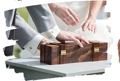 Для винной церемонии по второму варианту потребуется коробка, одна или несколько бутылок вина, письма молодожёнов друг другу, возможно, нужен будет ещё небольшой замок и ключик к нему, в зависимости от способа запечатывания коробки.