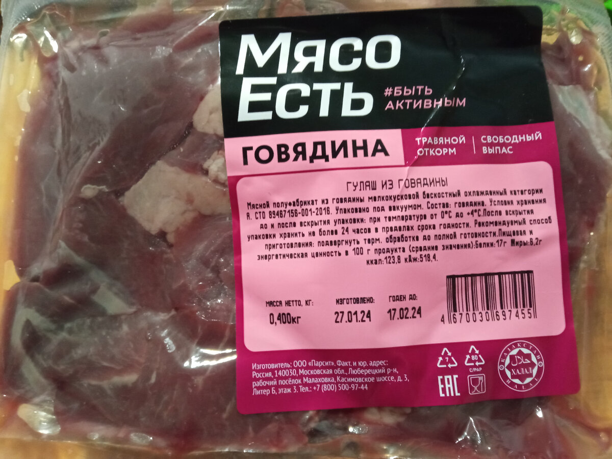 Дегустирую и делюсь мнением, стоит ли покупать и как на вкус. Говядина травяного откорма, в упаковке уже нарезанные кусочки мяса. Вскрываю упаковку, внутри вполне аппетитные куски говядины. Прополоскать нужно, конечно, что и сделал. Заморачиваться с готовкой особо не хочется, прикупил ещё и соус к гуляшу от «Магги». Всё, что нужно сделать - обжарить говядину с лучком, засыпать сухой соус да развести водой. И тушить под крышкой. Грею сковородку с парой ложек масла. Выложил мясо, жарю, вернее, жарит сковородка) Жарим на сильном огне минут 7-8 до румяности. Переворачиваем ещё минут 5 с другой стороны. Чистим и режем полукольцами луковицу и кладём к мясу, солим перчим. Жарим ещё 5 минут, пару раз перемешав. Я ещё добавил маринованного острого перчика. Если у вас нет, то и не надо. Можно красного молотого добавить по желанию. Высыпаем сухую смесь из упаковки. Заливаем горячей водичкой и перемешиваем. Воды нужно 350 мл по рецептуре. Убавляем огонь на минимум и тушим под крышкой час. Пару ра