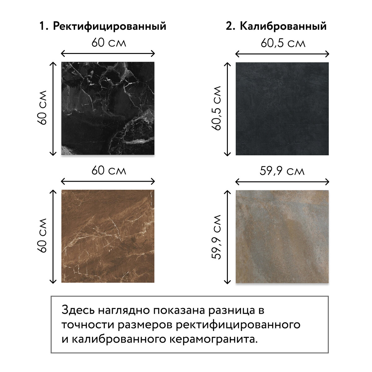 Точность размеров – характеристика, которой нельзя пренебрегать в процессе выбора керамогранита. По этому параметру различают два вида материала: калиброванный и ректифицированный. Калиброванный керамогранит на выходе из печи остается с естественными, необработанными краями, что приводит к небольшой разнице в размерах плиток (до 1-3 мм, и учитывайте, что темные тона больше поглощают тепловой энергии, а значит, больше сужаются, чем светлые тона). Это различие оно компенсируется за счёт межплиточных швов и по окончании работ будет почти незаметным. Такой керамогранит распределяется по партиям в зависимости от калибра (размера), поэтому при покупке важно сверять номер партии на упаковке. Ректифицированный – это керамогранит, края которого дополнительно обрабатываются после изготовления, что даёт максимально точный размер каждой плитки. Такой керамогранит обладает идеально ровными гранями, благодаря чему его можно укладывать с минимальным швом и создавать визуально практически монолитные п