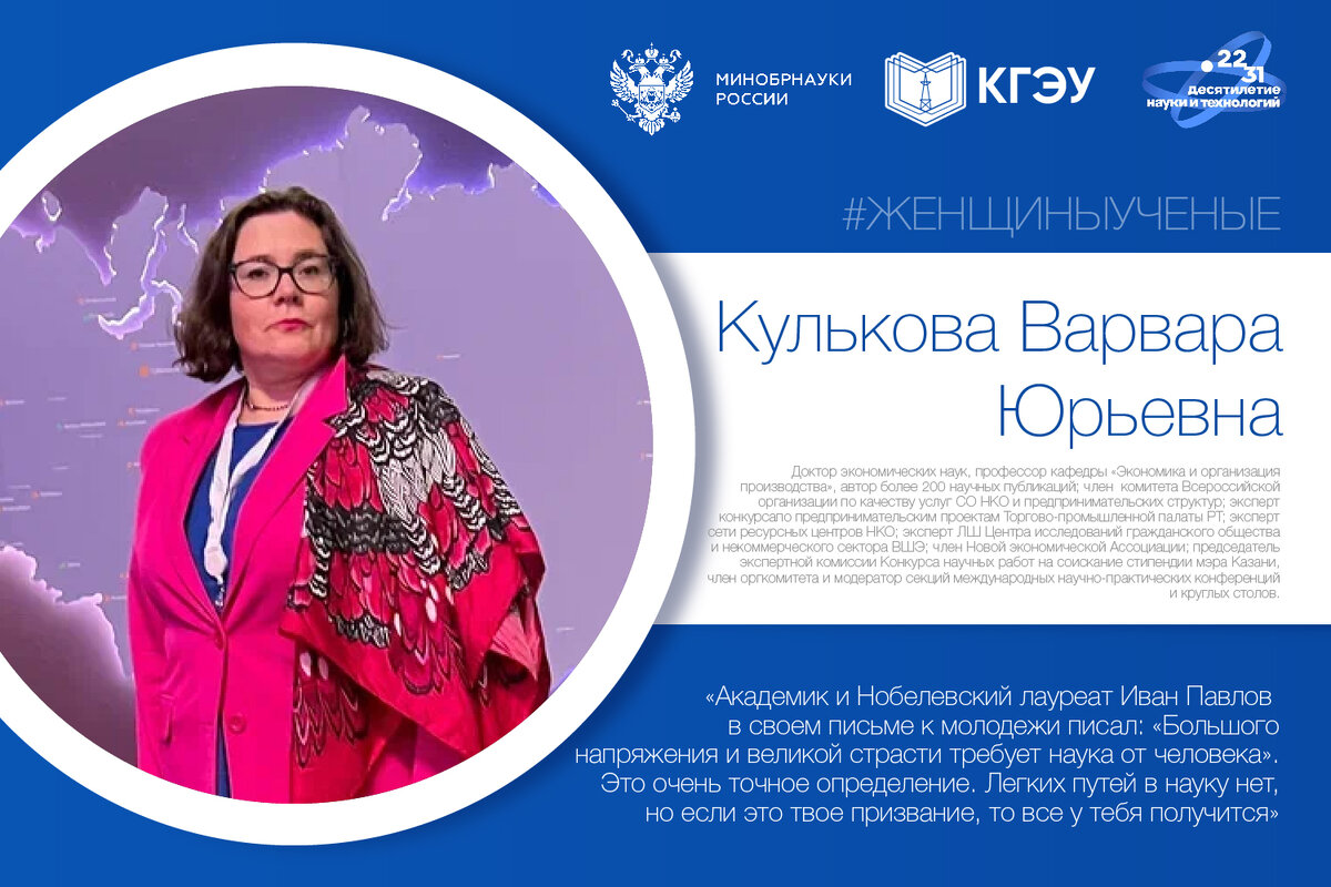 «Академик и Нобелевский лауреат Иван Павлов в своем письме к молодежи писал: «Большого напряжения и великой страсти требует наука от человека». Это очень точное определение. Легких путей в науку нет, но если это твое призвание, то все у тебя получится» Доктор экономических наук, профессор кафедры «Экономика и организация производства», автор более 200 научных публикаций; член комитета Всероссийской организации по качеству услуг СО НКО и предпринимательских структур; эксперт конкурса по предпринимательским проектам Торгово-промышленной палаты РТ; эксперт сети ресурсных центров НКО; эксперт ЛШ Центра исследований гражданского общества и некоммерческого сектора ВШЭ; член Новой экономической Ассоциации; председатель экспертной комиссии Конкурса научных работ на соискание стипендии мэра Казани, член оргкомитета и модератор секций международных научно-практических конференций и круглых столов. Кроме того, Варвара Кулькова является победителем Всероссийского конкурса на лучшую социальную прак