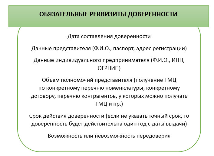ИП может доверить получение ТМЦ своему представителю. В этом случае ему потребуется оформить доверенность на унифицированном бланке или в свободной форме, но с сохранением всех обязательных реквизитов. Нотариального заверения доверенности не требуется, если иное не предусмотрено договором.