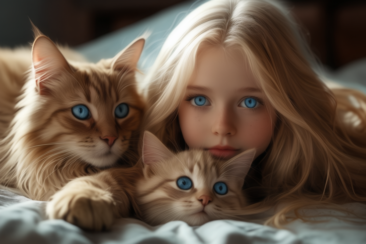 Скачать здесь В создании изображения был использован следующий промт: a girl with blue eyes and long blond hair lies on a pillow next to a kitten