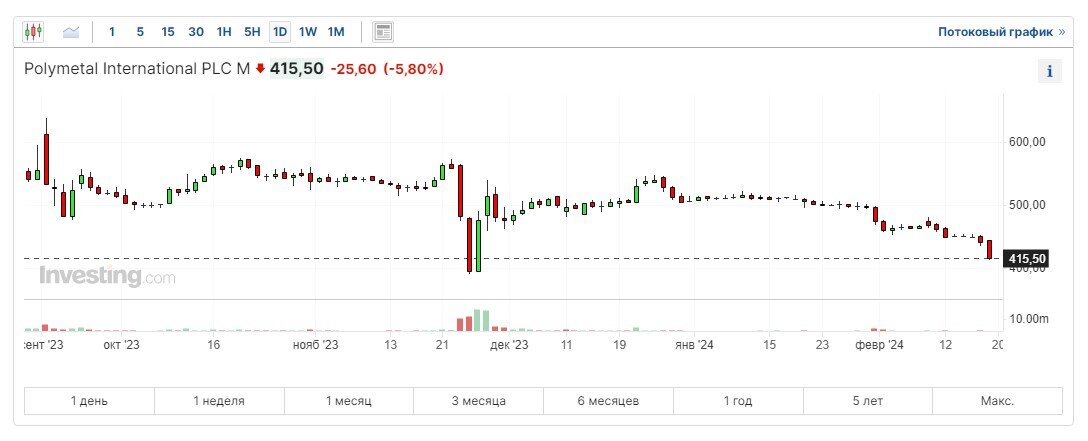Сегодня, 19.02.2024 активизировалось падение депозитарных расписок Полиметалла, можно сказать, что это "второй круг" падения. Первый был в конце ноября прошлого года. Тогда причиной стали новости о редомицилляции компании в Казахстан, писал об этом отдельно. Далее бумаги почти полностью восстановили свою стоимость, несмотря на то, что все идет к делистингу с Мосбиржи, и эти депозитарные расписки существенно превышают в стоимости акции, котирующиеся теперь в Казахстане, право владения которыми они подтверждают. Это очередной пример того, что частные инвесторы в России, которые сейчас составляют основу биржевых сделок, действуют не всегда логично. Все это, конечно, подпитывалось прогнозами брокеров о том, что бумаги должны вырасти еще на 20-30%. Какое-то время эти расписки держались примерно на одном уровне, уже более низком, чем ранее, несмотря на общий слабовосходящий тренд на рынке, но в какой-то момент начали опять снижаться. Это происходило на фоне ожидания новостей о продаже россий