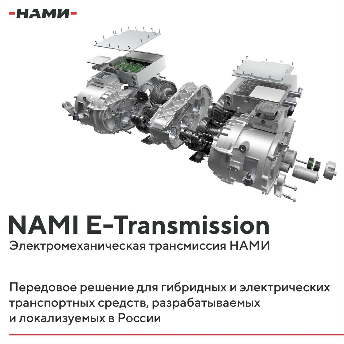 Научный автомоторный институт (ФГУП НАМИ) опубликовал информацию о своей новой разработке — это электромеханическая трансмиссия для легковых и легких коммерческих автомобилей. Модульная конструкция называется NAMI E-Transmission и включает в себя целое семейство модификаций с моторами мощностью от 110 до 300 кВт (150-408 л.с.), крутящим моментом — от 160 до 500 Нм. Общий КПД оценивается в 92%. Механизмы NAMI E-Transmission изолированы от пыли, грязи и воды. В состав системы входят: