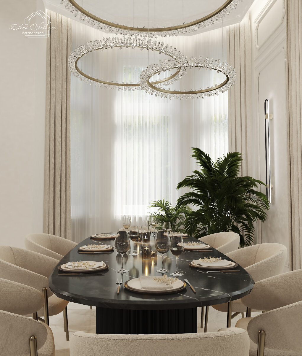 Золотистые ножки стульев и декоративные элементы создают атмосферу роскоши и подчеркивают внимание к деталям в дизайне, в то время как золотистые оттенки легко сочетаются с черным и светлыми цветами, придавая интерьеру гармоничность. Светильники в форме колец с хрустальными элементами великолепно сочетается с черным столом и светлыми стульями, создавая гармоничный ансамбль. Эта столовая приглашает вас погрузиться в мир элегантности арт-деко, где история встречается с современностью,