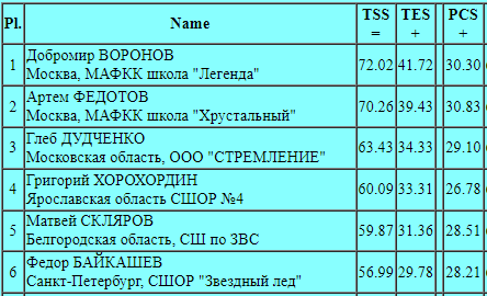 Прежде всего несколько слов о юношеской Спартакиаде, победители которой, если наша Федерация не внесет изменения в свой регламент, попадут в юниорскую сборную России на следующий сезон, а значит и на юниорские этапы Гран-при, даже если им будет только 12, а не 13 лет на момент 1 июля. Интерес вызывают прежде всего одиночные дисциплины. В первый день здесь прошла короткая программа у юношей. Смотрим на результаты :