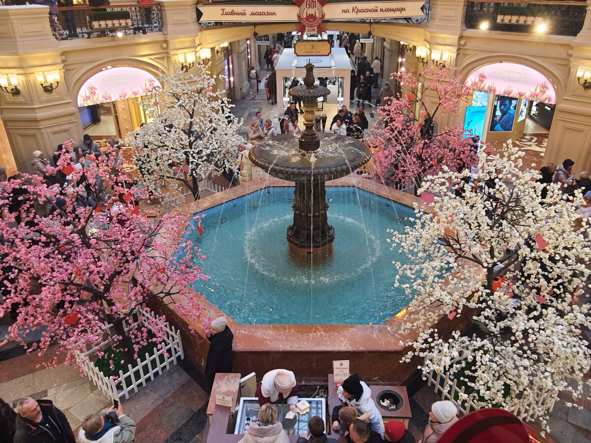 ГУМ -- это уже давно не только заведение торговли, но и место для уютного времяпровождения (особенно в холодную и пасмурную погоду). Чем заняться в ГУМе -- каждый спешит сюда по своему делу: за покупками, пообедать или встретиться с друзьями... Неважно. Но абсолютно каждый посетитель этого удивительного магазина может бесплатно наслаждаться оформлением его линий и центральной площади у фонтана. Сейчас здесь пришла весна. А весна -- это всегда время любви.