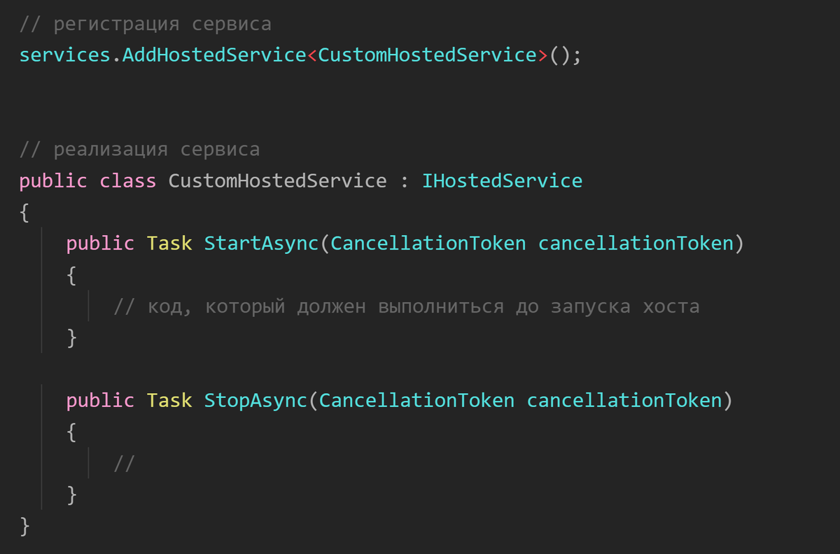 При разработке веб-сервисов зачастую возникают задачи, которые следует выполнять не в рамках обработки запросов, а в фоновом режиме. Примерами таких задач могут быть: В каждом из этих случаев удобно иметь некий постоянно либо периодически выполняющийся код, который отвечал бы за свою отдельную задачу. В asp.net доступны несколько способов создания подобных фоновых сервисов: Использование IHostedService Интерфейс IHostedService определяет два метода для реализации: Если вы реализовали интерфейс IHostedService и зарегистрировали его в DI через AddHostedService<>(), его метод StartAsync() будет вызван в процессе запуска приложения до того, как будет запущен хост, обрабатывающий входящие http-запросы. Таким образом, в этом методе можно выполнить задачи, которые необходимо завершить до запуска приложения. Например, применить миграции. Если вы хотите реализовать задачу, выполняющуюся на протяжении всего времени работы приложения, то вам нужно сделать отдельную задачу (Task), сохранить её в