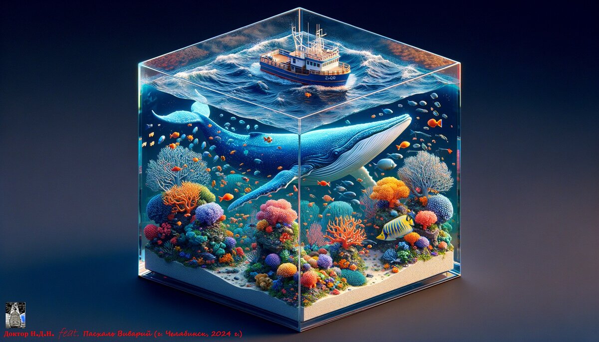Не найти в природе изъян! Я открыл шестой океан! Видите?..: Волны, пену, песок, разноцветные кораллы, рыбы и неуловимый морской конёк! Синий кит своим усом грозит. Наверное, хочет нас всех проглотить?