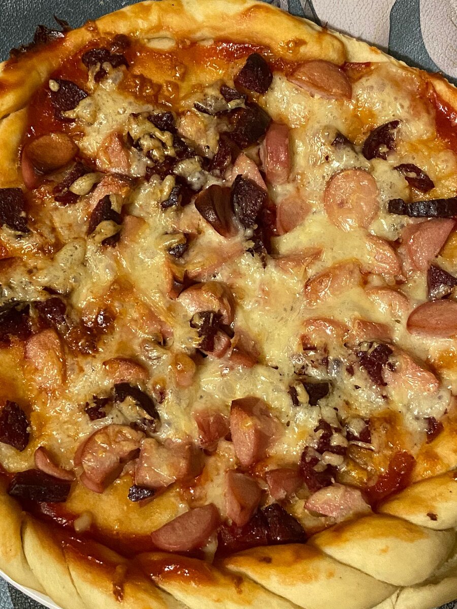 Замешать тесто.Час оставить для подьема.Раскатать,смазать томатным соусом или кетчупом.Начинку можно любую.Мы любим только сосиски и колбасу.Сверху натереть сыр.