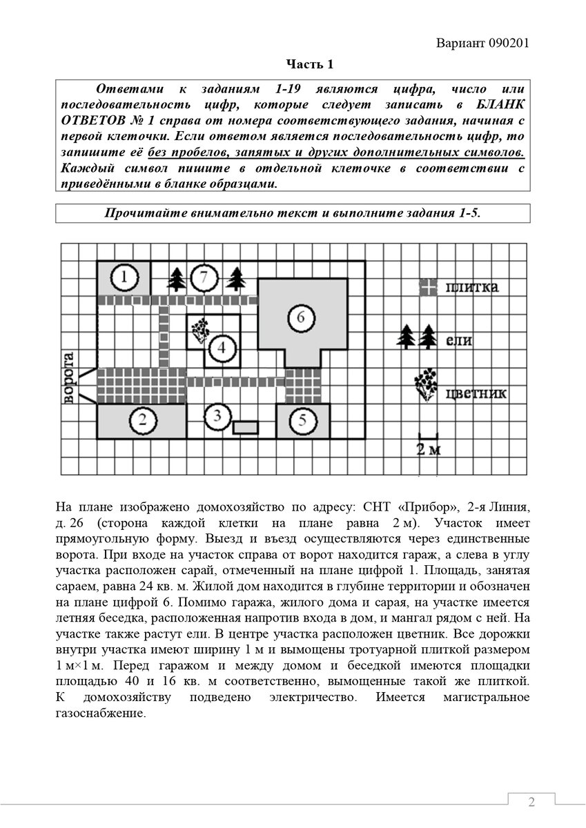Ответы выложим у нас в телеграм–👇 Часть 1 Ответами K заданиям 1-19 являются цифра, число или последовательность цифр, которые следует записать БЛАНК ОТВЕТОВ № 1 справа от номера соответствующего задания, начиная с первой клеточки. Если ответом является последовательность цифр, то запишите её без пробелов, запятых и других дополнительных символов. Каждый символ пишите в отдельной клеточке в соответствии с приведёнными в бланке образцами. Прочитайте внимательно текст и выполните задания 1-5. 1 - плитка 6 4 ели Ворота 2 3 5 цветник 2M На плане изображено домохозяйство по адресу: СНТ «Прибор», 2-я Линия, д. 26 (сторона каждой клетки на плане равна 2 м). Участок имеет прямоугольную форму. Выезд и въезд осуществляются через единственные ворота. При входе на участок справа от ворот находится гараж, а слева в углу участка расположен сарай, отмеченный на плане цифрой 1. Площадь, занятая сараем, равна 24 кв. м. Жилой дом находится в глубине территории и обозначен на плане цифрой