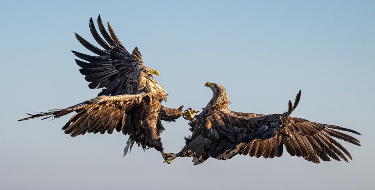 "Сидя в укрытии, я уже несколько часов наблюдала за этими орлами. Внезапно две птицы поднялись в воздух и устроили настоящий бой. Поединок продлился совсем недолго – буквально через минуту соперники вновь вернулись к своим занятиям, так что я буквально чудом успела сделать этот кадр"