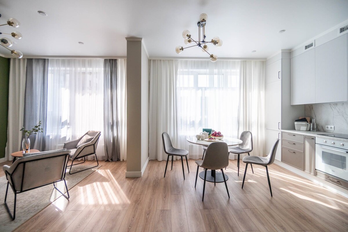 Окна квартиры выходят на солнечную сторону, а весь интерьер выполнен в светлых тонах с природными акцентами, поэтому днем буквально все пространство будет залито светом. А это плюс 100% к настроению!