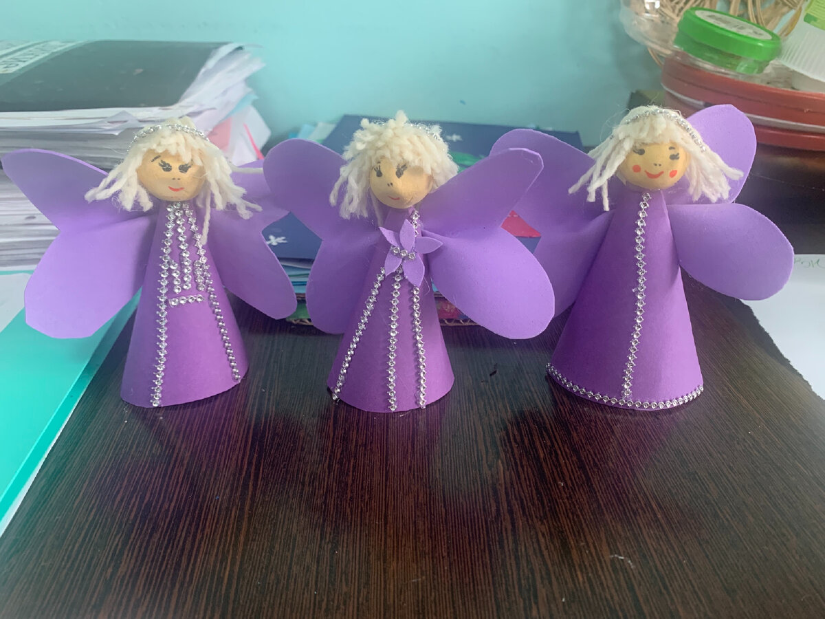 Далее вырезали крылья ангелам и феям. Розовые ангелы- это ранее стоял образец и видно, что его крылья из плёнки, нам для них дали фоамиран ( гибкий материал, с него часто цветы изготавливают). Сначала заготовку рисуем на бумаге, обводим и вырезаем- форма крыльев на свой вкус- ангельская или фейская😉