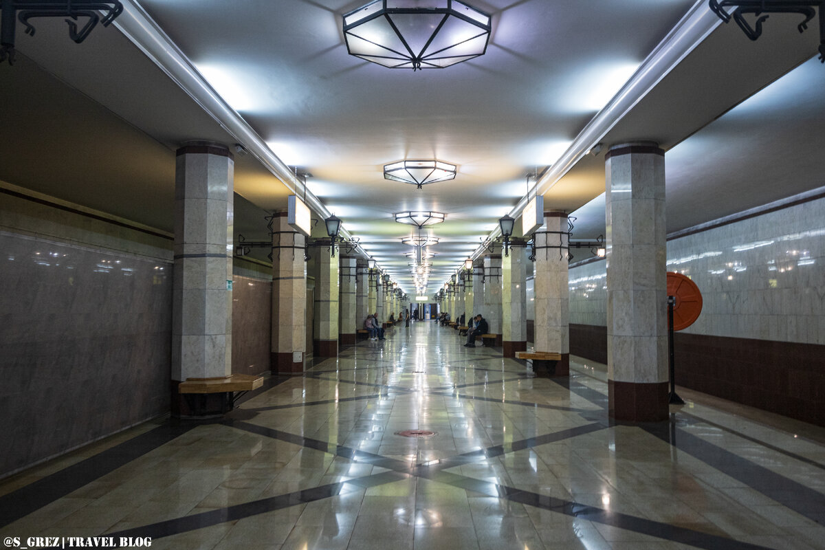 Со станции Кировской нам повезло успеть на последний поезд до конечной станции, перед закрытием метрополитена, таким образом получилось отснять весь метрополитен за один раз. Внутри поезда мы были единственными пассажирами.