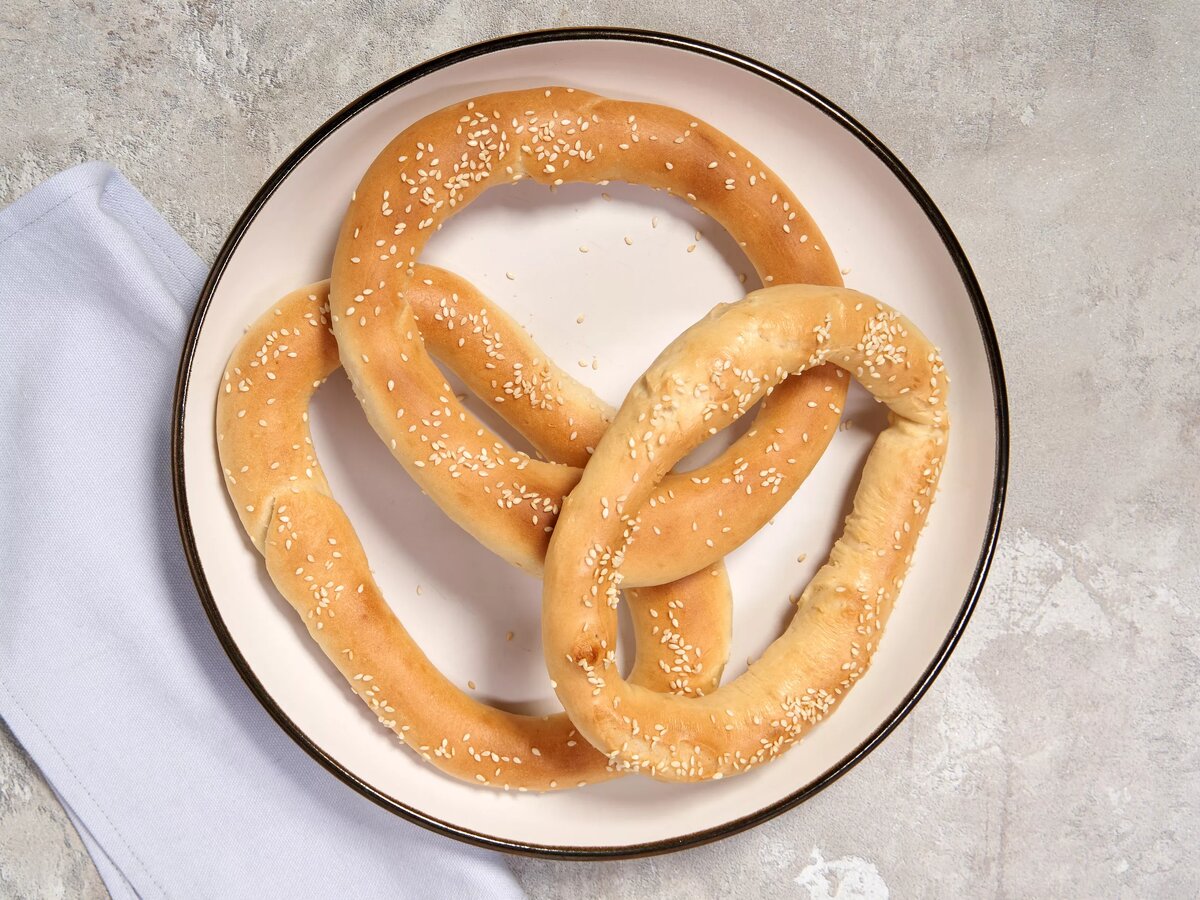 - Достаньте заготовки из кипятка и выложите на противень с пергаментной бумагой. Равномерно посыпьте заготовки кунжутом и поставьте выпекаться на 20 минут. Когда бублики увеличатся в объеме и хорошо подрумянятся, достаньте их из духовки и немного остудите.