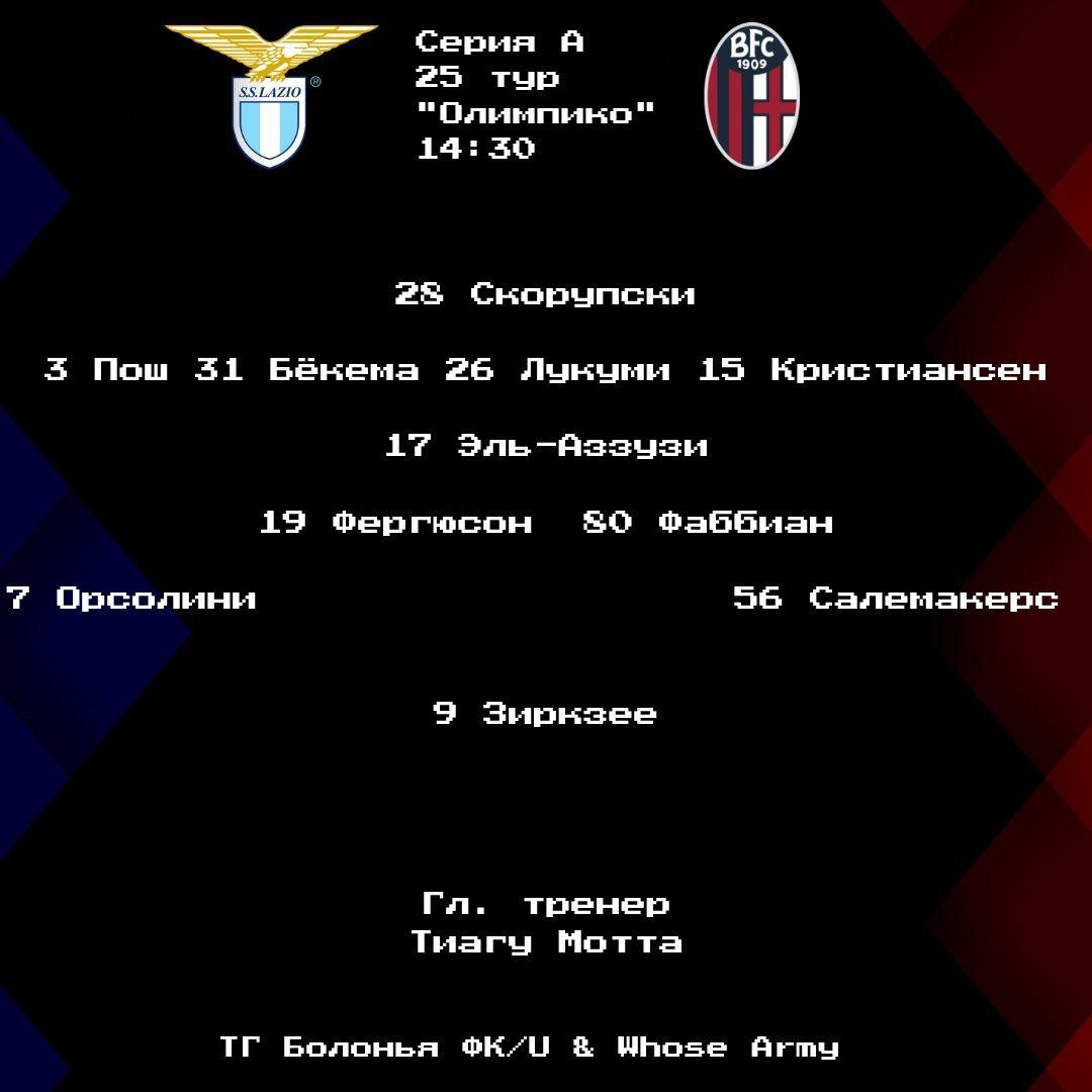 Мотта, несмотря на то, что фантазировал о Лукуми в опорной зоне, все таки выставил профильного опорника, Эль-Аззузи. Колумбиец же, после сильного матча на неделе, вновь стартовал в паре с Бёкемой в центре защиты. В ворота вернулся Лукаш Скорупски. Стартовые минуты прошли в убаюкивающе спокойном темпе, не считая опасного удара Фергюсона на 2'. Затем «Лацио» начал активнее прессинговать, а «Болонья» не смогла избежать ошибок. Гол хозяев пришел после неудачного паса Лукуми на Фергюсона: «Бьянкочелести» быстро доставили мяч на Иммобиле, а тот вернул под удар Исаксену. Датчанин вообще провел отличный первый тайм. Мог оформлять дубль, но Скорупски в отчаянном прыжке перевел мяч на угловой. «Болонья» явно страдала. На своей половине поля - опасность ошибок под гнетом агрессивных «Лациале», на чужой - просто перекати-поле. Ноль моментов - хозяева грамотно встречали все попытки БФК поднять голову. Помогла ошибка Проведеля в билд-апе: вратарь неудачно отпасовал, Фаббиан подхватил и отдал Эль-Аззузи: Уссама забил первый гол за «Россоблу». Второй тайм «Болонья» сыграла активнее - возможно, потому, что «Лацио» отдал слишком много сил, гоняя гостей вблизи их штрафной. Стали проходить долгие отрезки владения, пару раз опасно подали угловые, но Пошу продолжает не везти. «Лацио» отвечал попытками забросить мяч на ход Тати Кастельяносу, и однажды аргентинец был близок, но Скорупски вовремя вышел из ворот и отвёл угрозу. И вот, на 79', у «Болоньи» прошла действительно классная комбинация с отличным кроссом Кристиансена, на который откликнулся Зиркзее и вогнал мяч в сетку. Shock totale - и «Лацио» прийти в себя так и не смог. 4 (Четвертая!) подряд победа в Серии А для подопечных Тиагу Мотты далась крайне нелегко. В первом тайме «Лацио» спокойно могли накидать ещё 2-3 мяча в сетку Скорупского, но на данный момент Провидение на стороне БФК. Проведель - тоже.