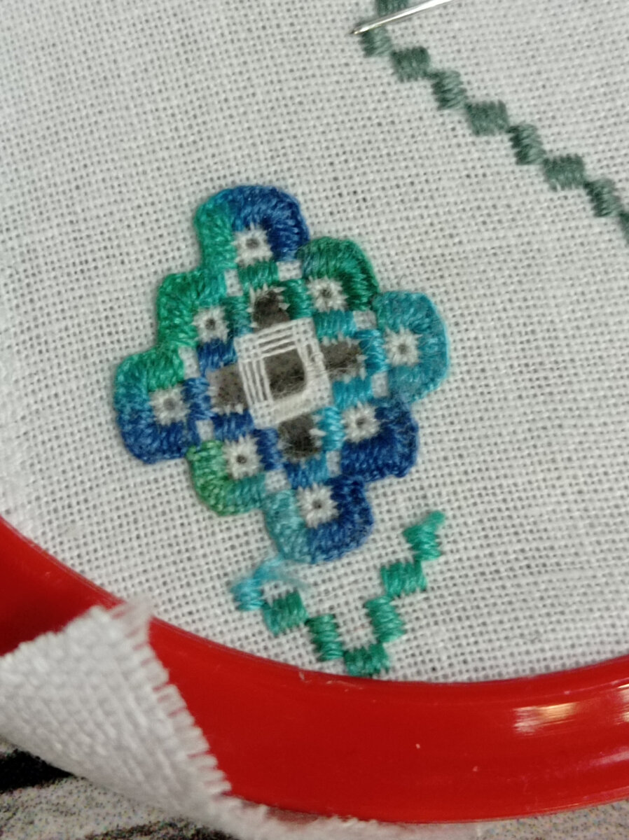 На прошлой неделе я поймала "весенний" свет и меня потянуло на микровышивки со страшной силой . Из основ, под рукой была бязь и перкаль. Из ниток- мулине Гамма, причем разной степени колючести. А потянуло меня на такую технику, как Хардангер. Ну и было весьма любопытно проверить "личные пределы". Схему я взяла из учебных небольших салфеточку на Пинтерест. Начала вышивать ( вон та серо зелёная полоска, справа на фото). Но мне не понравилось как пушит нитка. Да и укрывистость все же немного меньше чем хотелось бы. Все же Хардангер - это довольно объемистая техника. А у меня скорее счётная гладь выходила.. Так что я вспомнила где видела 30 хлопок Гутерман и сказалась за ним после работы. И наследующий же день села пробовать. И это совсем другие ощущения от нити! В итоге то, что планировалось как "пробник в уголочке" стало вот такой микроминиатюрной салфеточкой. Глазки и бриды шила Мадейрой 80 Из нюансов микровышивки, с которыми я столкнулась: - нитка должна быть не длиннее 50 см или махри
