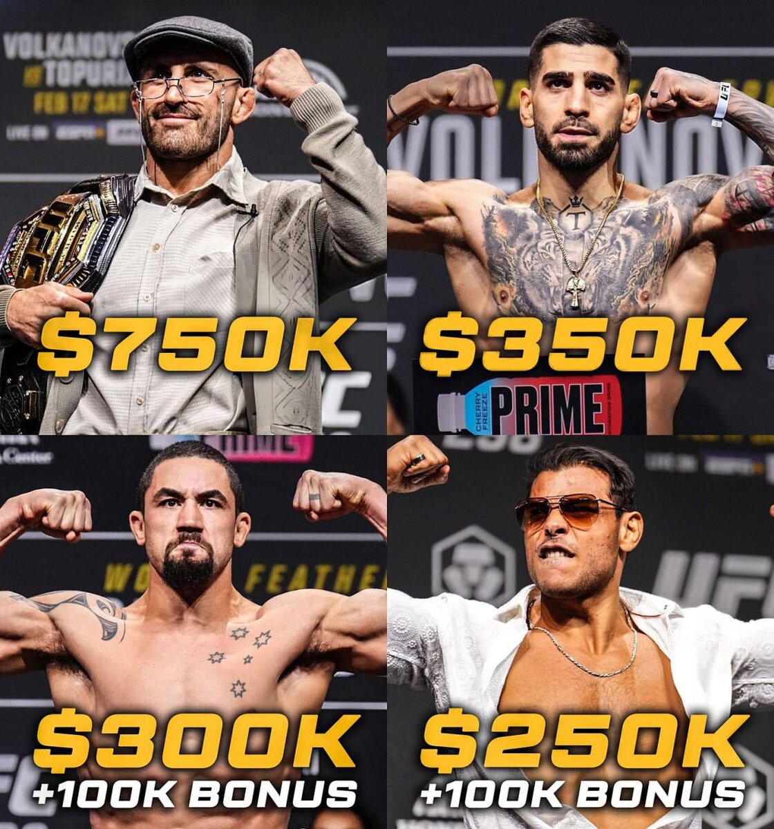 💥🛑UFC 298 турнирида жангчилар ишлаб олган пуллар малум булди. Алекс Волкановски: 750 000 Илия Топурия: 350 000 + 50.000 Пауло Коста: 250 000 + 100.000 Роберт Уиттакер: 300 000 + 100.000 Йен Мачадо Гэрри: 55 000 Джефф Нил: 108 000 Генри Сехудо: 150 000 Мераб Двалишвили: 105 000 Энтони Эрнандес: 66 000 + 50.000 Роман Копылов: 80 000 Маккензи Дерн: 200 000 + 50.000 Аманда Лемос: 80 000 + 50.000 Ринья Накамура: 23 000 Карлос Вера: 12 000 Миньян Чжан: 10 000 + 50.000 Брендсон Рибейро: 10 000 Дэнни Барлоу: 10 000 Джош Куинлан: 12 000 Обан Эллиотт: 10 000 Валентайн Вудберн: 15 000 Андреа Ли: 70 000 Миранда Мэверик: 75 000 ❗️Бундан ташкари жангчиларга яна PPV ва хомийлардан тушган пуллар хам берилади.