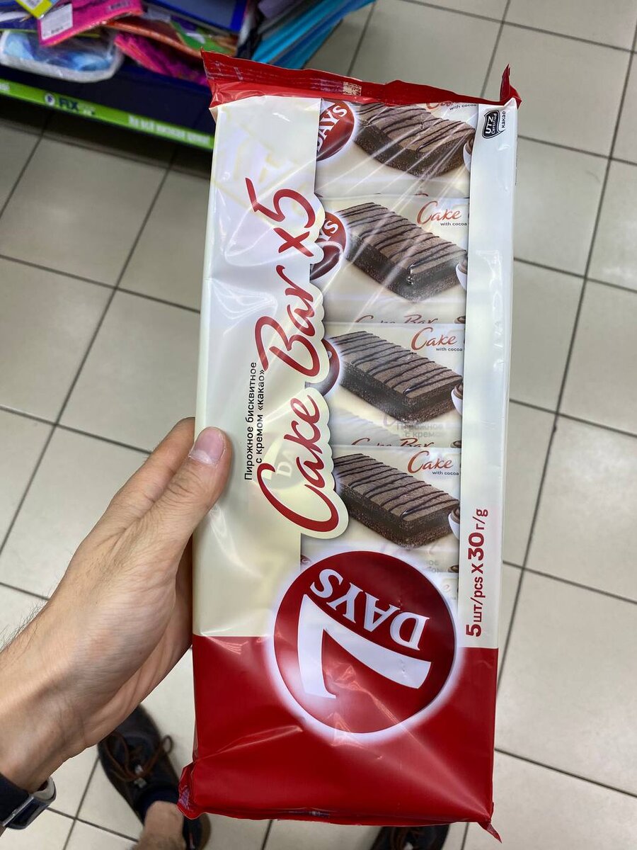 Вкусно вполне, хоть состав и не очень Всем привет! Захотелось с утра порадовать себя кофе с пироженкой. Как ни странно, десерт "Cake Bar" от "7DAYS" раньше не пробовал, хотя в принципе не сладкоежка, так что многие популярные десерты как-то проходят мимо. У меня вариант с кремом "Какао". Упаковка оформлена вполне красиво. Масса пирожного составляет 30 граммов, что оптимально для одного кофе-/чаепития. Сбоку напечатаны даты производства и окончания срока годности продукта. (Немного не внимательность, купил просроченную, пришлось вернуть товар и купить свежую, обращайте внимание на сроку годности). С другой стороны указаны штрих-код и разная информация на казахском языке. Снизу - та же информация на русском. К сожалению, в составе немало добавок, что, впрочем, предсказуемо для подобных продуктов. Есть алкоголь, что ощущается и во вкусе, но не отнесу это к минусам. ) Изготовитель - ООО "Чипита Санкт-Петербург". В целом пирожное неплохое, мягкое и вполне вкусное. Детям его покупать не стои