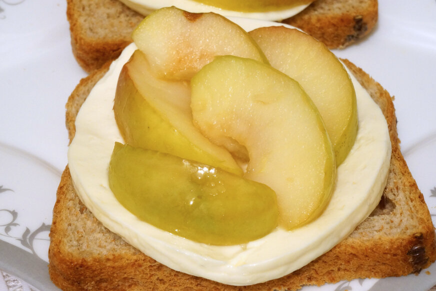 Это даже и не совсем бутерброд, а почти что мини-тортик из хрустящего тоста, вкуснейшего сыра и карамельными яблоками. Очень вкусно, попробуйте. Необходимые продукты: Хлеб тостовый зерновой (или любой другой который любите) — примерно 4-5 кусочков