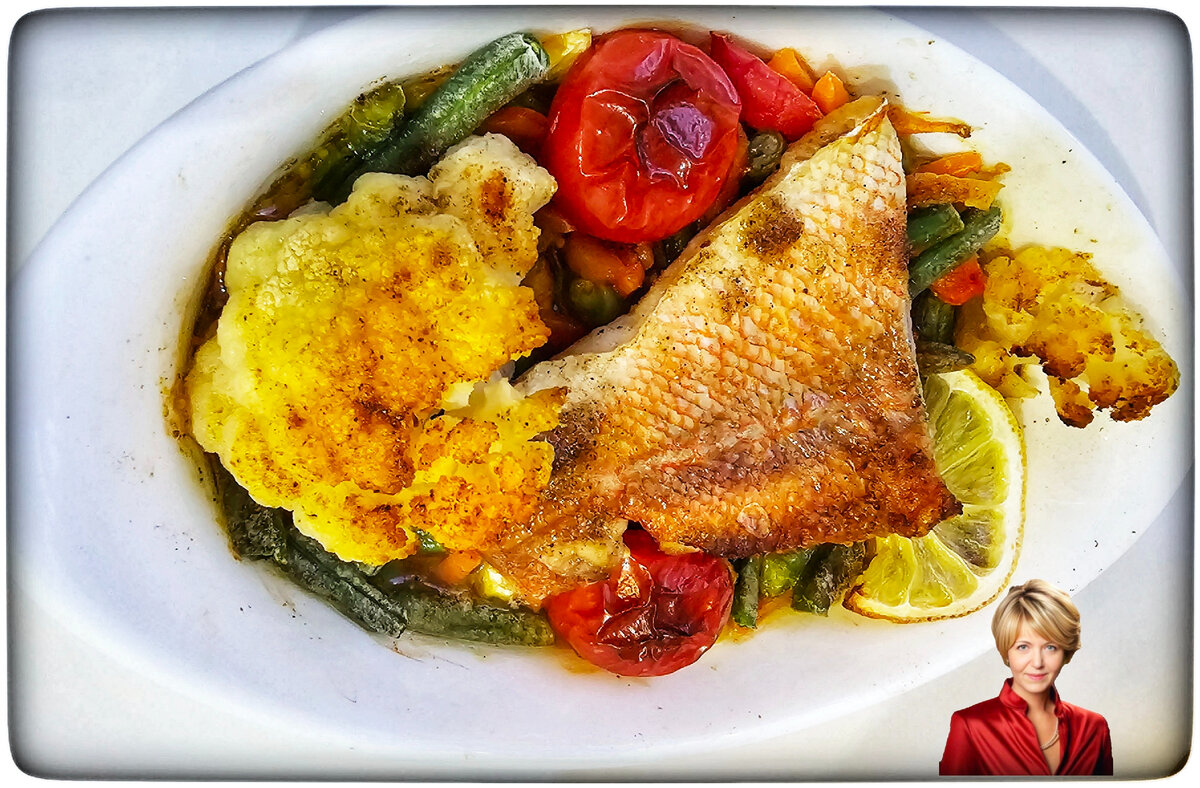 Рекомендуется в свой рацион включать, хотя бы два раза в неделю, рыбу. Какая рыба полезнее - речная пресноводная или морская. Конечно речная рыба уступает морским обитателям по содержанию микроэлементов: марганца, меди, фтора и йода. Также морская рыба содержит ненасыщенные жирные кислоты Омега 3. Включая ее в рацион можно улучшить своё здоровье. Сейчас всё дорого и рыба в том числе, но тем не менее можно найти доступную рыбу и вкусно ее приготовить, даже замороженную. Сегодня в главных ролях морской окунь. А приготовим мы её по-итальянски из русских продуктов. Берем доступные овощи, кладем на дно формы, посыпаем любимыми пряностями. Филе окуня моем, промокаем бумажным полотенцем, избавляемся от лишней жидкости и кладем на овощную подушку. Рыбу обильно сбрызгиваем соком лимона, перчим. При желании можно посыпать чесночным порошком. Ставим форму запекаться в духовку. Запекаем при температуре 190 градусов 25 минут, время приготовления зависит от размера и толщины рыбного филе. Рыба с о