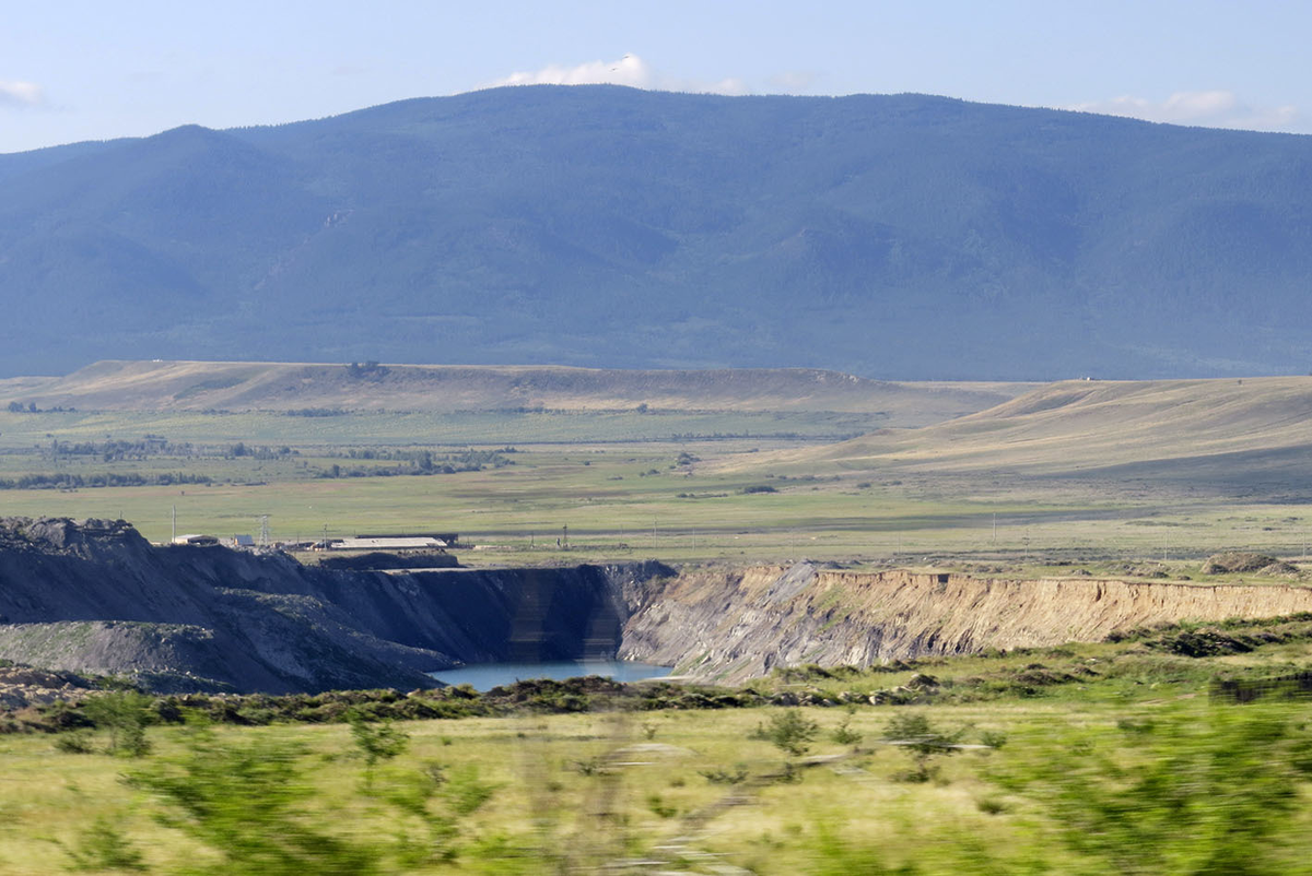 Километрах в 100 от Улан-Удэ в сторону монгольской границы начинаются вот такие пейзажи - Орхонский и Загустайский разрезы бурого угля с озёрами на дне лежат по разные стороны дороги. Облик Загустайской степи теперь определяет индустрия: