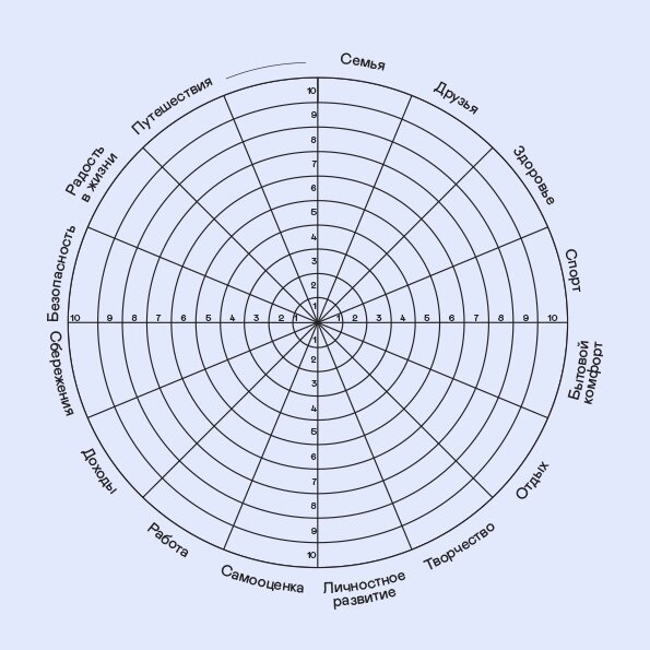 Колесо баланса представляет собой графическое изображение, разделенное на несколько сегментов, каждый из которых представляет отдельную сферу нашей жизни. Эти сегменты могут включать физическое и психическое здоровье, личные отношения, работу и карьеру, духовные и эмоциональные нужды, уровень самореализации и т.д.