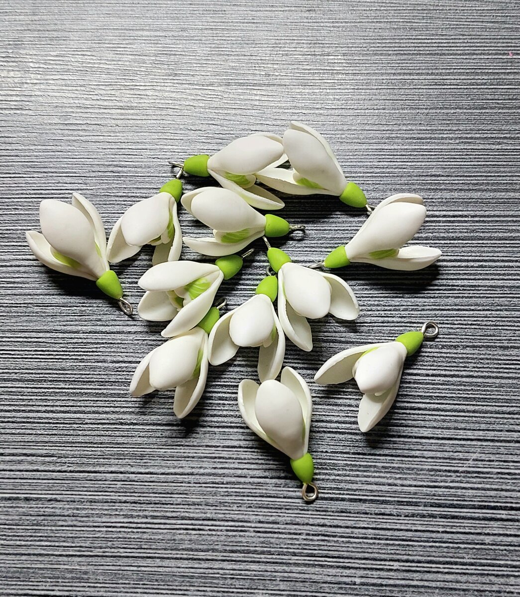 Добрый день! Сегодня покажу как лепить самый первый весенний цветок - подснежник! Для начала нам понадобится -желтая полимерная глина -пины с петлей -иголка -нож Делаем капельку из желтой полимерной глины. Капелька диаметром, в широкой части, 3-4мм. Затем, ножом делаем насечки, для имитации тычинок. Далее, нам понадобится зеленая и белая полимерная глина. Будем делать внутренний ряд лепестков. Глину нужно скатать вот в такие цилиндры. Разрезаем цилиндры на 4 части, а одну четвертинку белой глины разрезаем еще пополам. Получается 4 части зеленой глины и 5 - белой. Складываем глину вот таким образом. Чередуя белую и зеленую глину. Начинаем вытягивать трость. разрезаем трость пополам и складываем. Вытягиваем трость еще раз) Еще раз разрезаем и складываем. Здесь я решила, что зеленого цвета очень много и нужно добавить белых прожилок. Для этого я делаю несколько надрезов вдоль бруска, со стороны зеленого цвета, и вкладываю полоски белой глины. Продолжаем вытягивать трость. Разрезаем