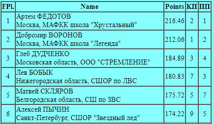 Несколько неожиданная, но без сомнения заслуженная победа с очень ярким прокатом под "Пиратов Карибского моря". Только чистый прокат с двумя каскадами 3+3 нужен был Артему и он его показал, а меня лично особенно впечатлило спасение тройного лутца во второй половине программы, когда Артем проявил незаурядную координацию и устойчивость. Ждем теперь продолжения соперничества Добромира и Артема на Первенстве России по младшему возрасту. Уже в пятницу у них начинаются элементы и нужно успеть добраться до Йошкар-Олы.