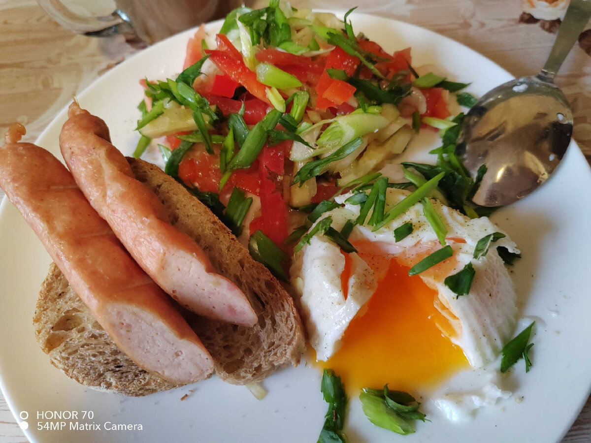 Завтрак с домашней сосиской, яйцом на парý и салатом