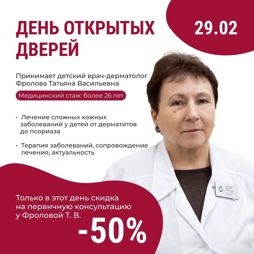 Мы рады пригласить вас на День Открытых Дверей к ведущему детскому врачу - дерматологу и к заведующей отделением ГБУЗ НО ДГКБ № 27 «Айболит» — Фроловой Татьяне Васильевне, которая принимает пациентов в нашем медицинском центре «Чистая кожа» в Сормово.