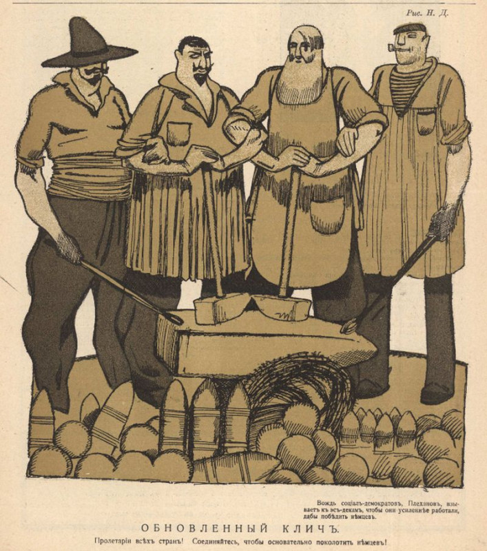 Карикатура на Г.В. Плеханова из либерального журнала «Новый Сатирикон». 1915 год. «Вождь социал-демократов, Плеханов, взывает к эс-декам, чтобы они усиленнее работали, дабы победить немцев. Обновлённый клич. Пролетарии всех стран! Соединяйтесь, чтобы основательно поколотить немцев!»
