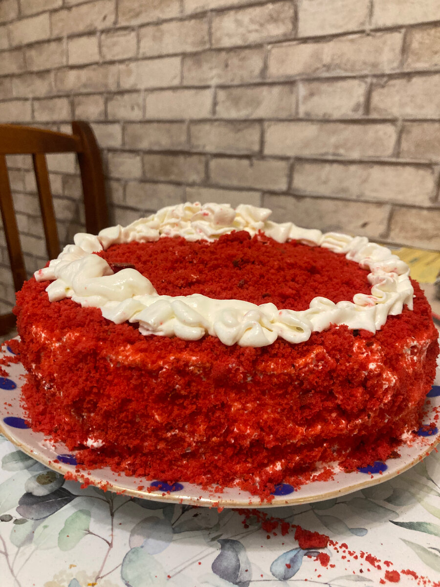 Если вы захотели сготовить торт своими руками, то «Красный бархат» - идеальный выбор торта. Итак, делюсь рецептом: Ингредиенты: Тесто: Мука пшеничная - 340 г Сахар - 300 г Какао-порошок - 1 ст.л. Разрыхлитель теста - 2 ч.л. Сода - 1 ч.л. Яйцо куриное - 3 шт. Масло растительное - 300 г Кефир 2,5% - 280 г Краситель пищевой (красный) - 3-4 капли Крем: Сливки 33% - 500 мл Сыр творожный сливочный - 140 г Сахарная пудра - 4 ст.л. (с горкой) 2.. Форму застилаем бумагой для выпечки или выкладываем в силиконовую форму. Выливаем тесто. Коржи лучше выпекать подольше, чтоб пропеклись. У меня получилось 4 коржа - один пойдет на украшение. Выпекаем по 15 мин при температуре 180-200•. Пока выпекаются коржи, готовим крем. 3.Сливки взбиваем до загустения, добавляем творожный сыр и сахарную пудру. 4.Выкладываем коржи и каждый слой промазываем кремом. Можно добавить прослойку из вишни или любого джема. 5.Затем смазываем весь торт кремом и посыпаем измельченным коржом. На приготовление торта «Кр