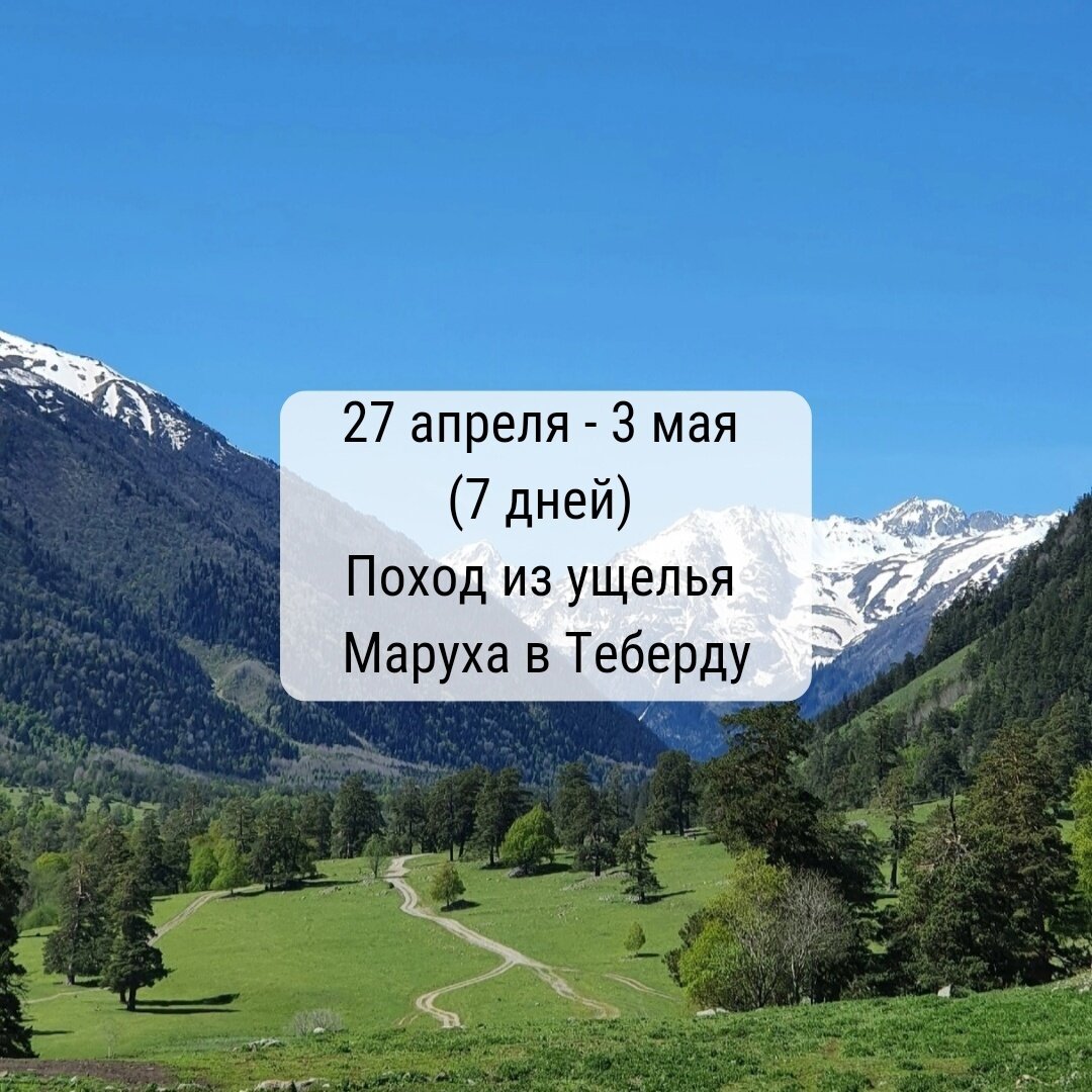 В зависимости от погоды и состоянии группы, гид может изменить маршрут. Погода в мае бывает разная (наличие снега, его плотность), поэтому в походе заложен запасной день. 1 день. В 10:00 встречаемся в станице Зеленчукской и пересаживаемся на УАЗ, который забросит нас в ущелье Маруха. Заброска занимает примерно 3 часа. По приезду разбиваем лагерь на берегу реки, разводим костёр. Наблюдаем панораму гор с извилистой частью реки Маруха, которая в этом месте замедляет своё течение. 2 день. Ранний подъем, завтрак. Собираем лагерь и выдвигаемся навстречу первому перевалу Хадюка 2978 м. Подходим под перевал или сможем его пройти — зависит от погоды, состоянии тропы. Маршрут до перевала 5.5 км, набор 1000 м. Спуск на ночевку. 3 день. После завтрака собираем