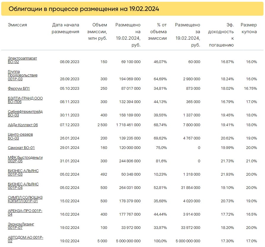 Коротко о торгах на первичном рынке 19 февраля стартовали два размещения. Выпуск ЭкономЛизинг 001Р-07 был размещен на 33,97% (33 млн 972 тыс. из 100 млн рублей) за 212 сделок. Выпуск АВТОДОМ АО 001P-02 объемом 5 млрд рублей был полностью размещен в первый день торгов за 5 сделок. Коротко о торгах на вторичном рынке Суммарный объем торгов в основном режиме по 397 выпускам составил 1055,6 млн рублей, средневзвешенная доходность — 15,64%. 📊 Подробнее в ВДОграфе Больше актуальных новостей читайте оперативно в нашем телеграм-канале