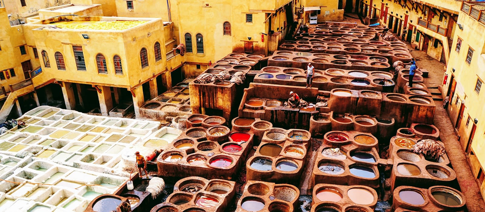 Марокко славится своими яркими красками и изысканными украшениями. Здесь смешивается сразу несколько культур, образуя колоритную и завораживающую смесь. Прежде чем перейти к видам традиционной одежды мы бы хотели рассказать про одну из главных достопримечательностей Марокко, тесно связанную с текстильной и модной индустрией. Эта достопримечательность поражает и одновременно повергает в шок туристов и называется она – красильни. Красильни находятся в Фесе, всего их несколько и самая знаменитая – Шуара. Город с древних времен славился своими кожаными изделиями и именно здесь центр этой отрасли. В красильнях до сих пор выделывают кожу по старинному рецепту вручную, здесь же ее, окрашивают, сушат и приводят к «торговому виду». Все действие происходит под открытым небом, в больших старинных чанах. Так почему же красильни шокируют туристов, ведь отчасти экзотическое и историческое зрелище должно заинтересовывать? Все дело в витающих там ароматах: кожу выделывают без применения современных те