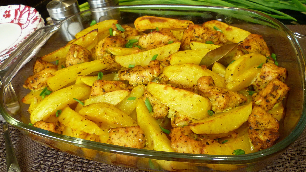 Всем привет! Филе индейки с картошкой в духовке, одно из вкусных диетических блюд, которые можно приготовить как в будни, так и на праздники. Мясо нежное, не жирное и мягкое на вкус, а картофель, просто тает во рту. Индейка гораздо вкуснее курицы, но иногда я готовлю куриное филе с картошкой в духовке, и там есть свои тонкости в приготовлении вкусного и сочного блюда. Ну а сегодня рассмотрим все тонкости приготовления грудки индейки. Ингредиенты: Приготовление: 1. Размораживаем филе, если оно из морозилки, или берем охлажденное, и нарезаем на кубики. Можно 3 на 3, или 4 на 4 см, как вам нравиться. 2. Добавляем специи, масло растительное и соль, масла 1 ложку, и соли 1 чайную ложку, перемешиваем руками, можно надеть перчатки, чтобы не испачкать руки, так как специи их могут окрасить. И оставляем на столе, тем временем очищаем картошку. 3. Картофель среднего размера, очистить, хорошо вымыть, порезать на 4 или 6 частей, в зависимости от того какая она по размеру. Добавить ложку масла и со