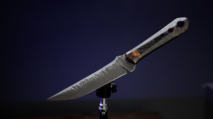 Добрый! Сделали такой нож в свободное время: Названия нет. Просто лежал старый бланк D2 и решили пустить в дело. На клинке битый камень (уже сто лет не делали), твердость 61HRC. Рукоять из стабилизированной карельской берёзы. Ничего необычного, просто получился славненький походный нож Всем спасибо за внимание! ПыСы нож уже продан, просто показываю.