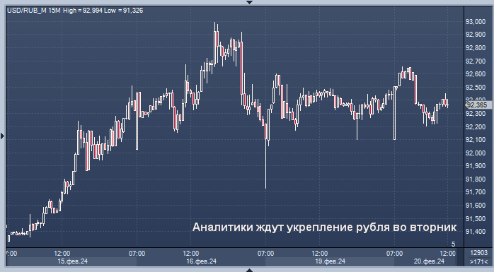 Этому будет способствовать усиление активности экспортеров Этому будет способствовать усиление активности экспортеров Курс доллар/рубля на Мосбирже интервалами в 1 минуту Курс доллар/рубля на Forex интервалами в 4 часа По мнению экспертов "Интерфакс-ЦЭА", на рубль давит негатив на мировых рынках капитала с учетом сниженной активности инвесторов - американские биржи в понедельник закрыты в связи с празднованием Дня президентов. Кроме того, отрицательно на динамику нацвалюты влияет санкционная тематика - в Брюсселе проходит заседание Совета ЕС по иностранным делам, на котором может быть утвержден 13-й пакет антироссийских санкций. Вместе с тем поддержку рублю оказывает продажа компаниями-экспортерами выручки в рамках подготовки к налоговым выплатам месяца, которые им предстоит произвести 28 февраля. "Возобновление торгов юанем после завершения длинных праздников в Китае не привело к резкому росту волатильности на валютном рынке. Курс USD/RUB в данное время находится у 92,2 руб./$1. Други