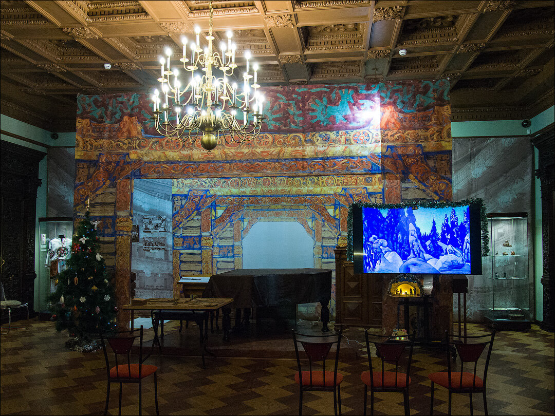 Сияли огнями люстры под затейливыми потолками, а со стен глядели семейные фото, и лики икон, и звонкие витражи… Мы вошли в зале через потрясающей красоты резные деревянные двери, и словно погрузились в иной мир, в иную эпоху, где писались волшебные картины, и сочинялись декорации и костюмы для спектаклей, где дети качались на деревянной лошадке, а в комнатах стояли тонкой работы восточные ширмы, и резные деревянные шкафы, и статуэтки, привезённые из странствий в дальние и удивительные страны. При этом постоянная экспозиция музея посвящена именно российскому периоду жизни и творчества семьи Рерихов.