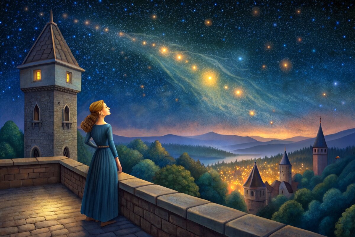 В далеком королевстве, где каждая звезда на небе была как маленькое сияющее окно в другой мир, жила девочка по имени Элиза. Элиза была мечтательной и умной девочкой, которая всегда смотрела на звезды и задавала себе вопросы о том, что ждет её в будущем. Однажды, когда ночь была особенно темной и звезды казались особенно яркими, Элиза услышала загадочный шепот ветра, который призывал ее к приключениям. "Следуй за мной, Элиза" - шептал ветер, словно мудрый старик, знающий секреты древних времен. Неведомая сила побудила Элизу отправиться в путешествие через темный лес, ожидая найти ответы на свои вопросы. Но кажется, будто время само начало играть с ней в игры: дорога запуталась, а ветви деревьев шептали зловещие предупреждения. Темные тени словно таили в себе секреты, не желая раскрывать их. Следуя за загадочным шепотом ветра, Элиза и ее друзья - веселый ежик Филипп, ловкий кролик Гарри и добродушный дракон Альфред - столкнулись с испытаниями, которые вынуждали их применять все свои силы
