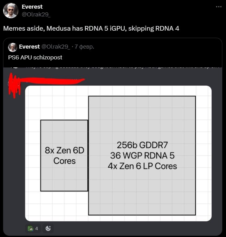 Сразу несколько инсайдеров сообщили о том, что процессоры AMD Ryzen из семейства Medusa будут использовать процессорные ядра Zen 6 и встроенную графику на основе архитектуры RDNA 5. Необычным моментом в данной ситуации стало то, что нам сообщают о полном игнорировании RDNA 4 для встроек в этом поколении. И да, высока вероятность того, что консоли PlayStation 6 могут получить именно процессорные Zen 6с и графику на основе RDNA 5. Аналогичной информацией о вероятных характеристиках PS6 ранее делились и другие инсайдеры. Впрочем, напомним, что инсайдерская информация может частично или полностью не совпадать с реальностью, а потому рекомендуем воспринимать ее с долей скептицизма.