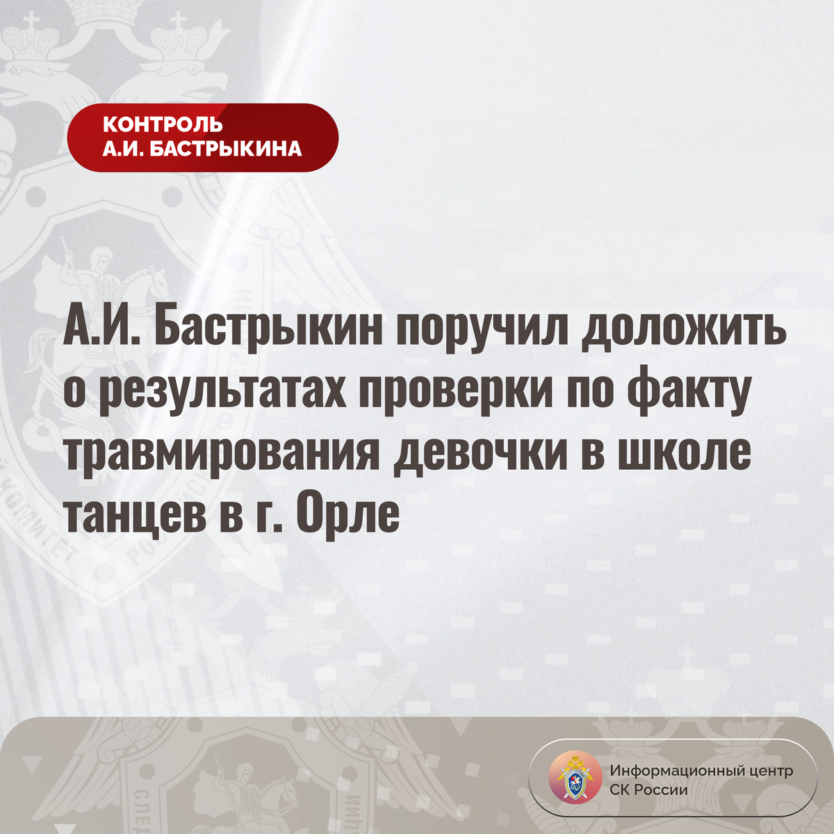 Председатель Следственного комитета Российской Федерации Александр Иванович Бастрыкин поручил и.о. руководителя СУ СК России по Орловской области Альберту Владиковичу Абрамяну доложить о предварительных и окончательных результатах процессуальной проверки, поставив ее на контроль в центральном аппарате ведомства.